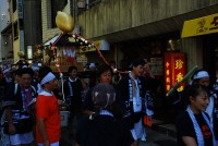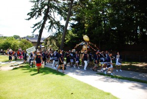 柿木畠に着いたが、神輿の姿はなかった。そうかと納得し、広坂の石浦神社へと向かう。歴史はないとは言え、神輿は神輿、神社でお祓いをした上で街に繰り出すのが正しい道だ。こちらがちょっと遅れたせいもあり、神輿とは21世紀美術館で遭遇した。お祓いをすませ、戻りの途中だった。いつもの面々が先頭を歩いていて、手を上げて挨拶してくれる。Mさん、Iさん、Gくんなど、いつもとはちょっと違う出で立ち(Iさんは同じか)で、勇ましい。まだ勢いは付いてないが、これから街に繰り出して水の掛け合いになるのだ。