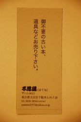 そんなこんなで、箱の中はかなり隙間が目立ち始め、それなりに売り上げがあったが、ボクにとっては、東京千駄木から来ていた「不思議」という店の店主Hさんとの出会いもまた楽しかった。「不思議」と書いて「はてな」と呼ぶ。千代田線千駄木駅からブラブラ歩いてくださいねという古本・古道具の店。Hさんの風貌も親しみやすく、おしゃべり自体も実に面白い。