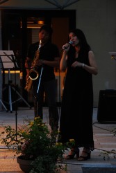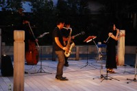 夜になって、「JAZZ AT 紺屋坂」はその魅力を発揮し始めた。会場である「ホテル兼六城下町」の建物、その奥に見える兼六園の森と古い木造建築、ほぼまん丸に近い美形の月も浮かんで、アイユールのアコースティックサウンドと、Yさんのシンプルな歌声がライブに活き活きとした空気を注ぎ込んでいく。何かが見えてきた感じがした…… アイユールも二日目に再登場してくれ、そこでも見事な演奏を聴かせてくれた。