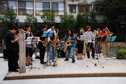 四時から初日の本番。出るのはまず、兼六中学校吹奏楽部に県立工業高校吹奏楽部という二回目を迎えた「JAZZ AT 紺屋坂」の、ある意味での目玉だ。ジャズとしての演奏内容は期待していないが、とにかく一回出てもらって、さらに来年も出てもらい、ジャズに目覚めてもらおうという魂胆。両学校側からも“出たい”という強い意欲が感じられ、参加となった。