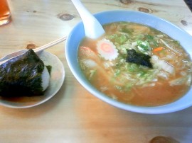 それから数分後、ボクの前に間違いなく野菜ラーメンとおにぎりが置かれた。いつもように素朴に美味かった。7月のエッセイ 『富山で入道雲を見て、ちゃんぽんめんを食ったことについて・・・』 でも書いたが、なんでもない普通の食堂で出てくる、ある意味的個性派ラーメンには逸材が多い。