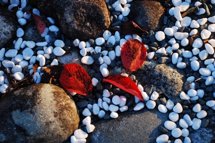 薄暗くなり始めた上高地だったが、そんな中で見る紅葉と黄葉の木々が美しい。河原の石も、やけに明るい色に見える。