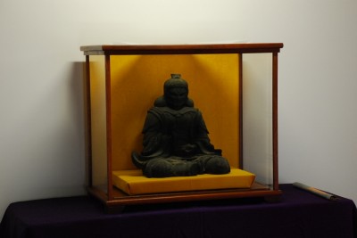その奥に弱い照明の当てられた透明の箱が置いてある。その中にお目当ての「毘沙門天坐像」が見えた。既に説明は進んでいて、先客の四人は真剣にそれに聞き入っている。