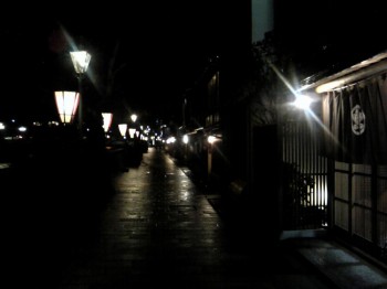 前日に見た検番前の桜の花は、かなり開き始めており、その開花の早さに驚かされる。小雨の中とはいえ、茶屋街の外灯に浮かび上がる桜の木の姿は、やはり色っぽかった。