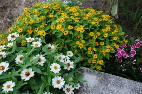 もう一度、話を戻す・・・ 奥には、何とかという白い花と何とかという黄色い花、それと赤白のナデシコや紫のサルビアなどが狭いスペースに咲いている。先にも書いたとおり、かなりボリュームが出てきて、もっとゆったりと植えてやれば良かったと悔いている。そのさらに奥に、ひまわりが十五本ほど種から出てきた。花の名前を思い出せないのと、花への思いとは比例していない。