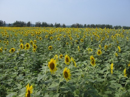 河北潟干拓地にある「ひまわり村」では、ひまわりが満開だ。なぜだか、陽が西から差しているのに、みな東の方を向いていたが、単なる鈍感なのか、反骨精神に満ち溢れた連中ばかりなのか分からない。しかし、とにかくひまわりたちは黄色く丸く開いていた。