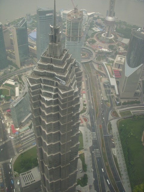 実際に覗いてみると、はっきり言って怖い。この不況の時代、何も怖いものはないわいと吠える日本のサラリーマンでも、ここでは素直に怖~いと言えたりする。眼下のビル群がみんな曲がって見えたりするくらいに、異様な高さの感覚だ。言い忘れたが、ビル全体の高さは492mで、これでも世界第3位なのだそうだ。ついでに言うと、ドバイにある世界一高いビルは、828m。そんなもん造って何するの?と聞いてみる気もさらさらないが、よく造ったね、ご苦労さんと言う気も全くない。それにボクはドバイ語も話せない。